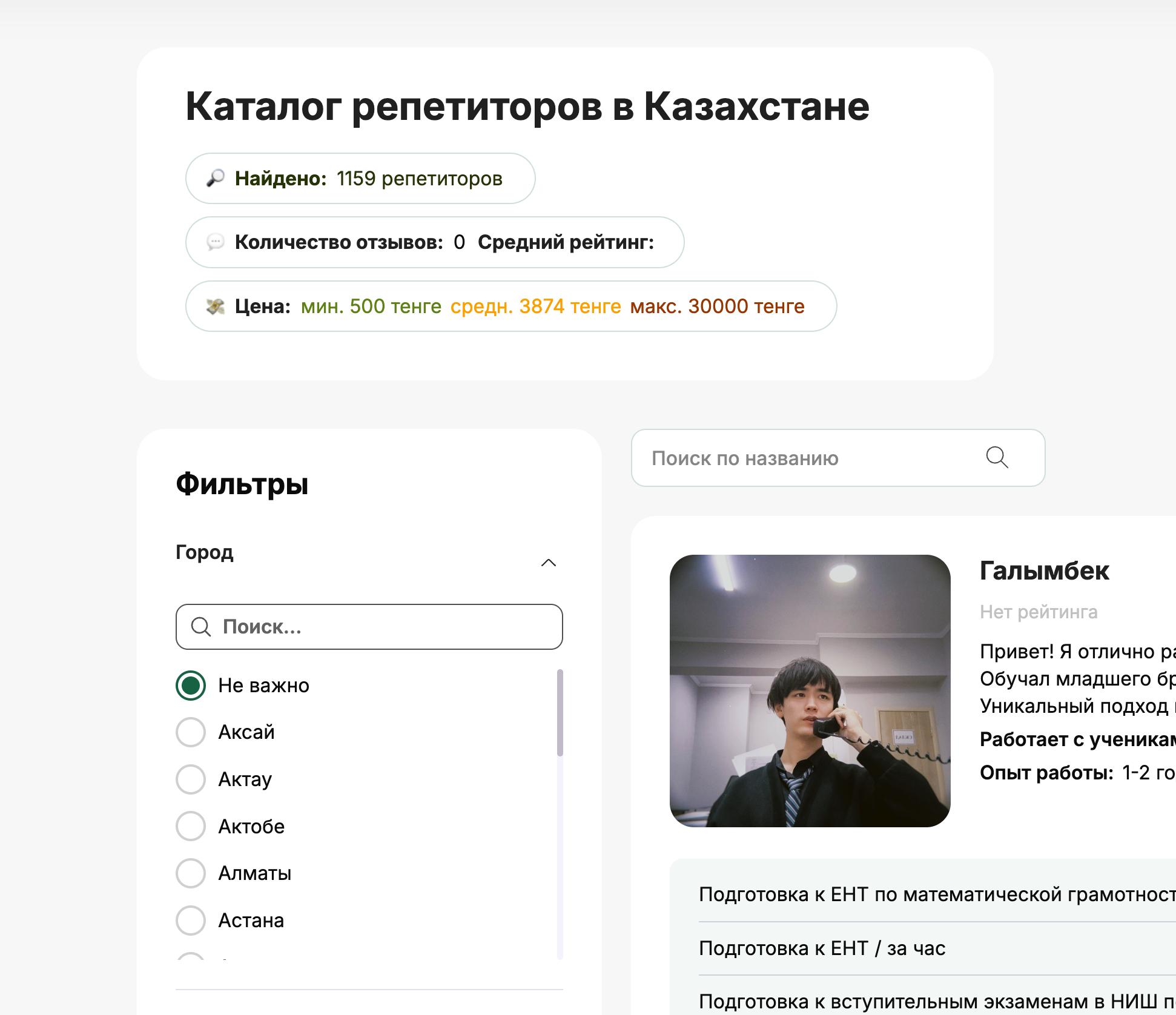 Tutors.kz сайтынан кез келген мақсатқа сай репетитор табуға болады. Ыңғайлы сүзгілер арқылы өзіңізге лайық маманды таңдаңыз.