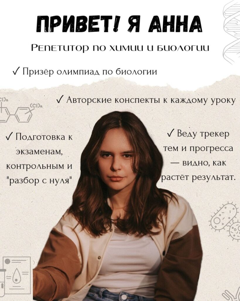 Меня зовут Анна — я репетитор по химии и биологии с системным подходом и душой. Помогаю ученикам влюбиться в предмет, понять сложное простыми словами и уверенно подготовиться к экзаменам любого формата.