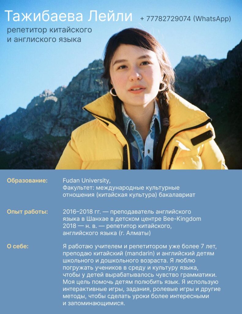 Я работаю репетитором уже более 7 лет, преподаю китайский (mandarin) и английский детям школьного и дошкольного возраста. Жила в Шанхае 12 лет, закончила Фуданьский университет.