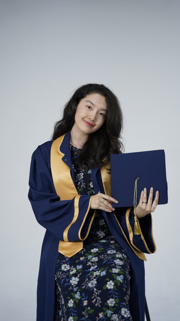 Я окончила Казахский университет международных отношений и мировых языков имени Абылай хана по специальности «Востоковедение (Корейское направление)».